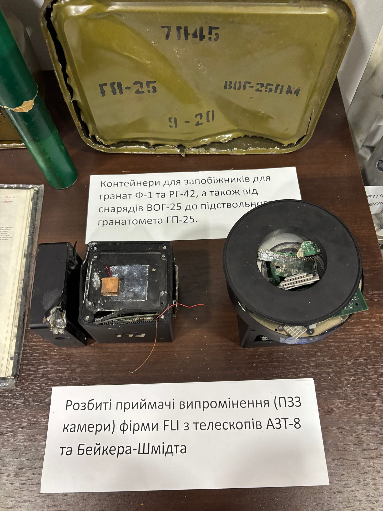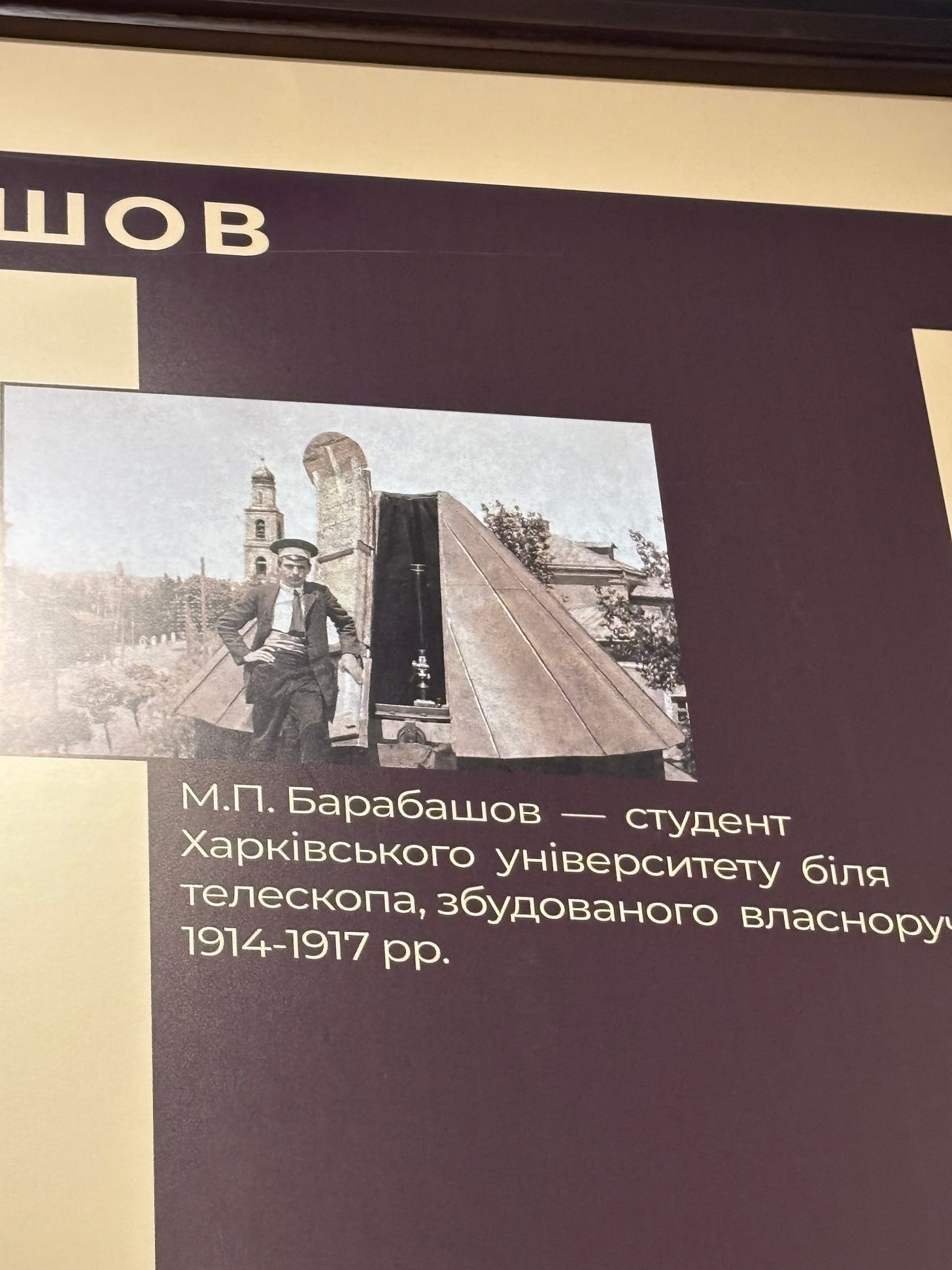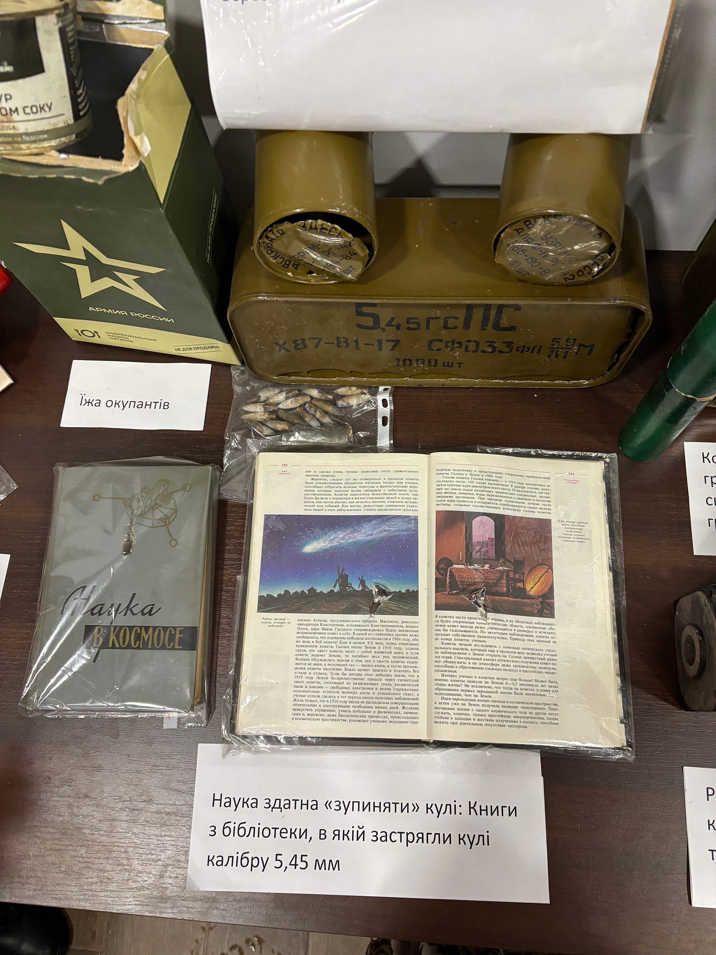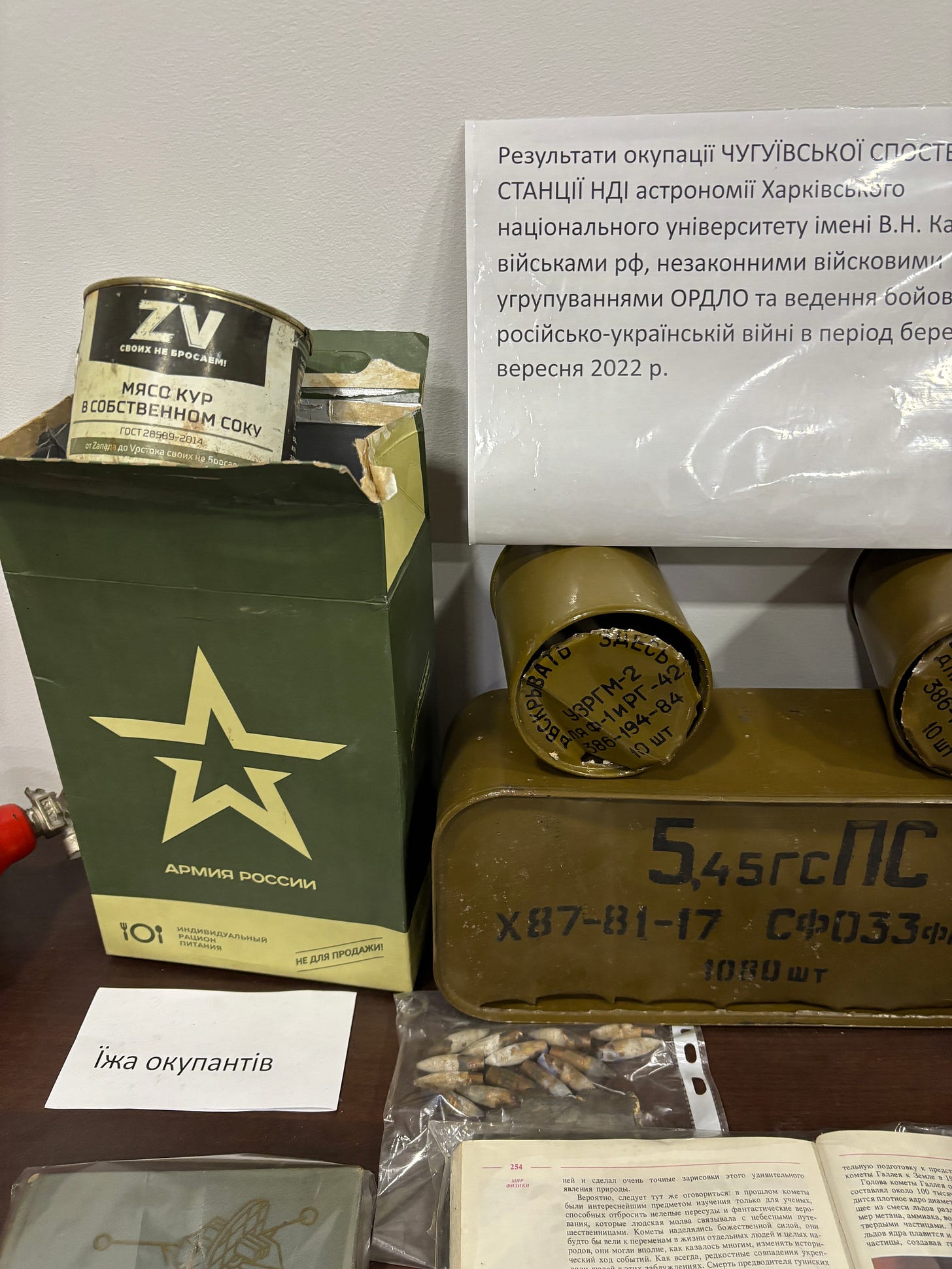 Inside of the main building of the museum, alongside what was left from the previous war, in the library, one stand is dedicated to a more recent occupation. As there is a metro under the institute’s territory in Kharkiv, stargazing is very limited. The most of the research has been conducted outside of Kharkiv at a station near Chuguiv. That station was occupied for several months in 2022 by the russian military.