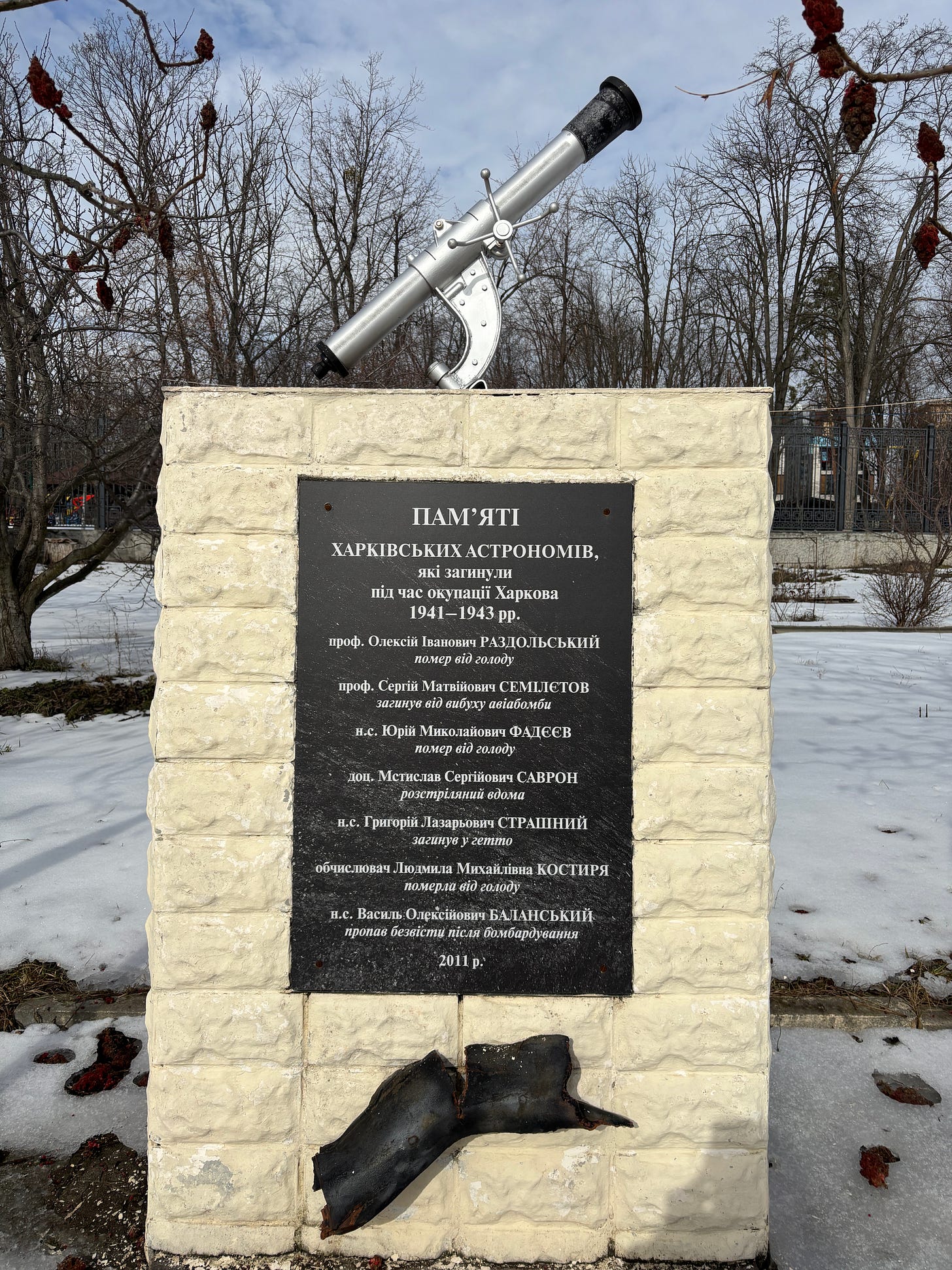 Just outside Barabashov’s favourite spot is a monument to the employees of the research institute who were killed during WW2. Most of them starved, were executed or hit by bombs under the Nazi occupation in 1941-43.