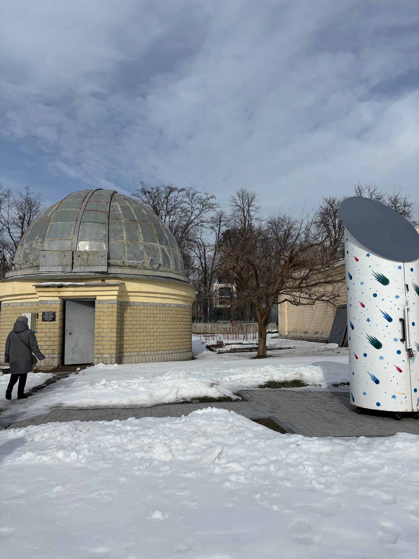 We walk past a series of round buildings that hide antique 19th century telescopes. Air defense continues spitting charges into killer drones.